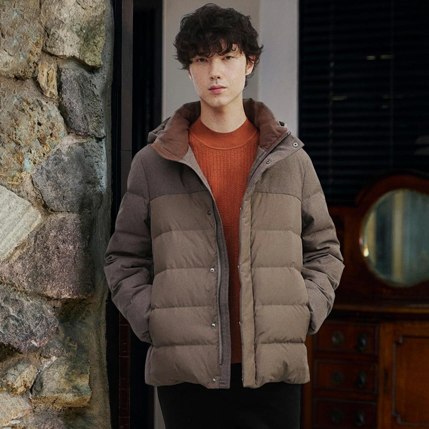 異素材の組み合わせが印象的なダウンブルゾン【デザインポイント】しなやかなでソリッドな合繊とウール調素材の配色切り替えが特徴のダウンブルゾン。身体に合わせた立体的なパターンによりスッキ.. |