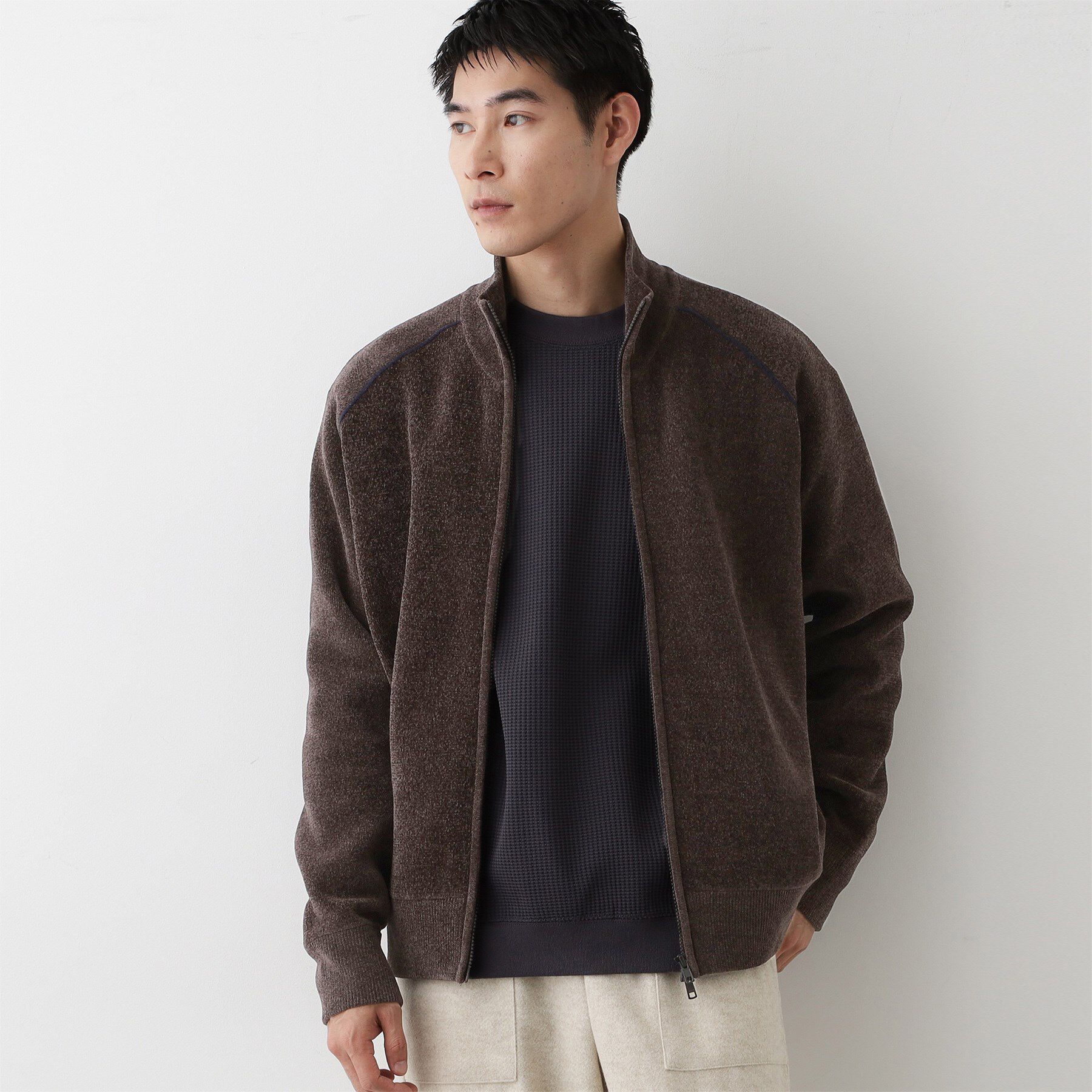 【デザインポイント】ミニモール使用のトラックジャケット。素材に雰囲気のあるモールを使用しています。アームホールのラインが特徴的です。【スタイリングポイント】カジュアルなボトムスやきれ.. |