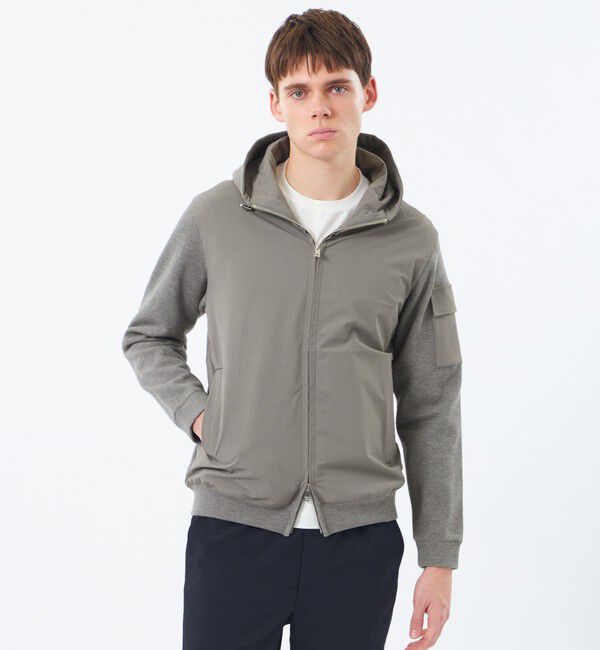 異素材のコンビネーション使いがアクセントになったフーデッドパーカー【デザイン】ダンボールニット素材のパーカーをベースに、前身頃とフード部分を同色異素材の布帛で切り替えたハイブリッドア.. |