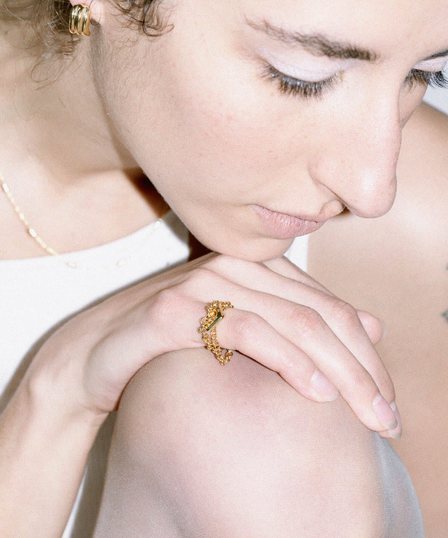 まるで現代アートのような、独創的な存在感を放つリング。不規則に歪んだシルエットや滑らかに波打つ表面が光を複雑に反射し、独特の雰囲気を放ちます。ボリュームがありつつも抜け感のあるデザイ.. |