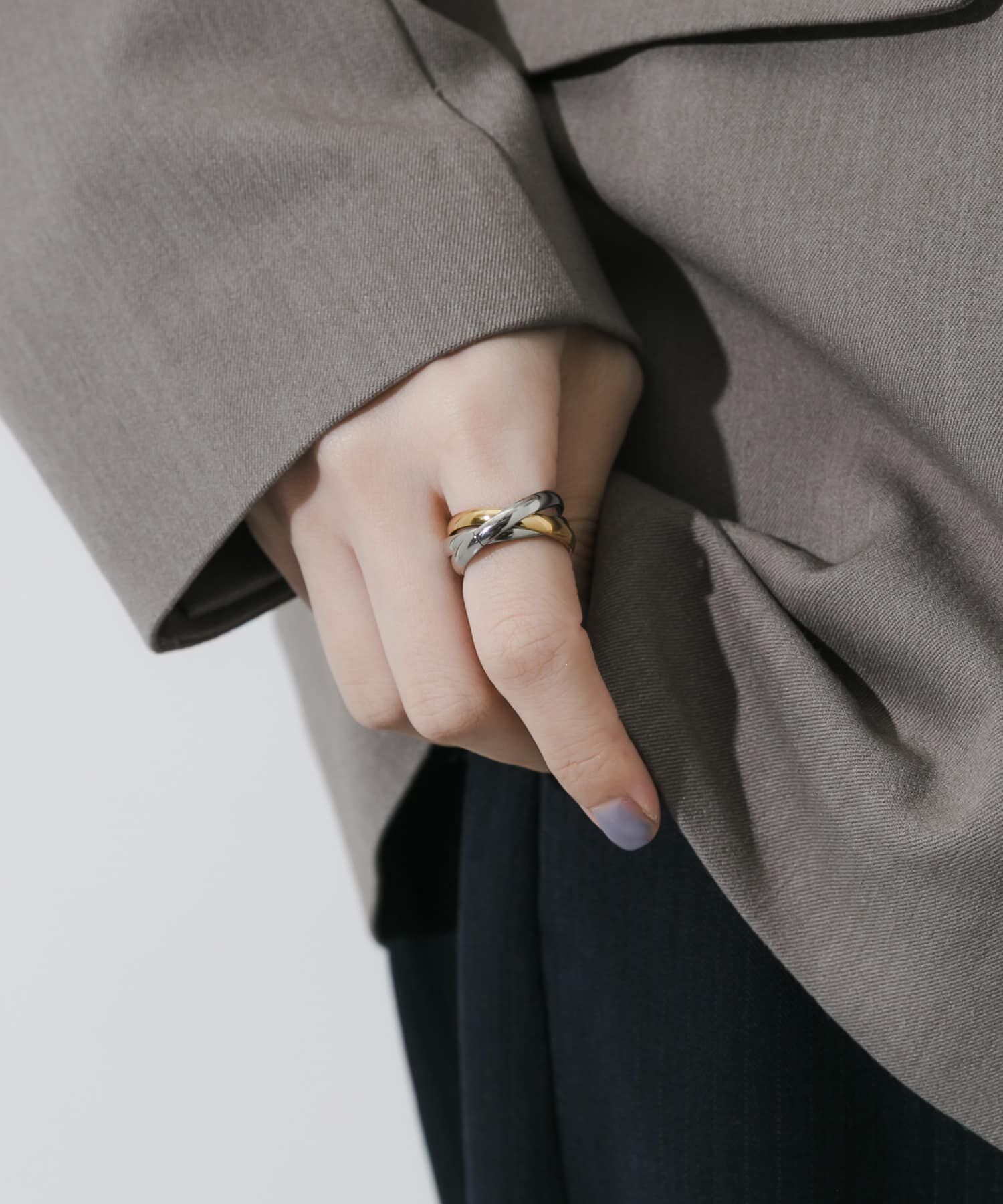 【手元に宿る洗練の重なり】●シルバーとゴールドを組み合わせたミックスカラーデザイン●3つのリングが絡み合うようなフォルム●肌に優しく錆びにくいサージカルステンレス素材異なるカラーのリング.. |