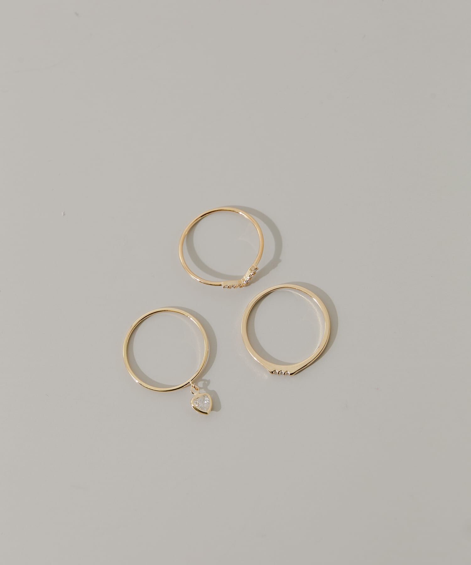 【ハート&ビジューリング3点セット】●個性豊か異なるデザインな3本セット●指をほっそりと見せてくれる華奢なライン●3本重ねても、バラバラに着けても決まるその日の気分で組み合わせを変えられる.. |