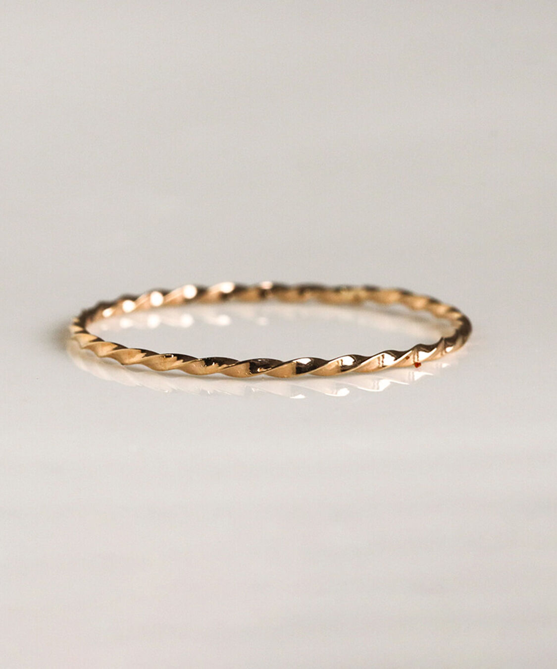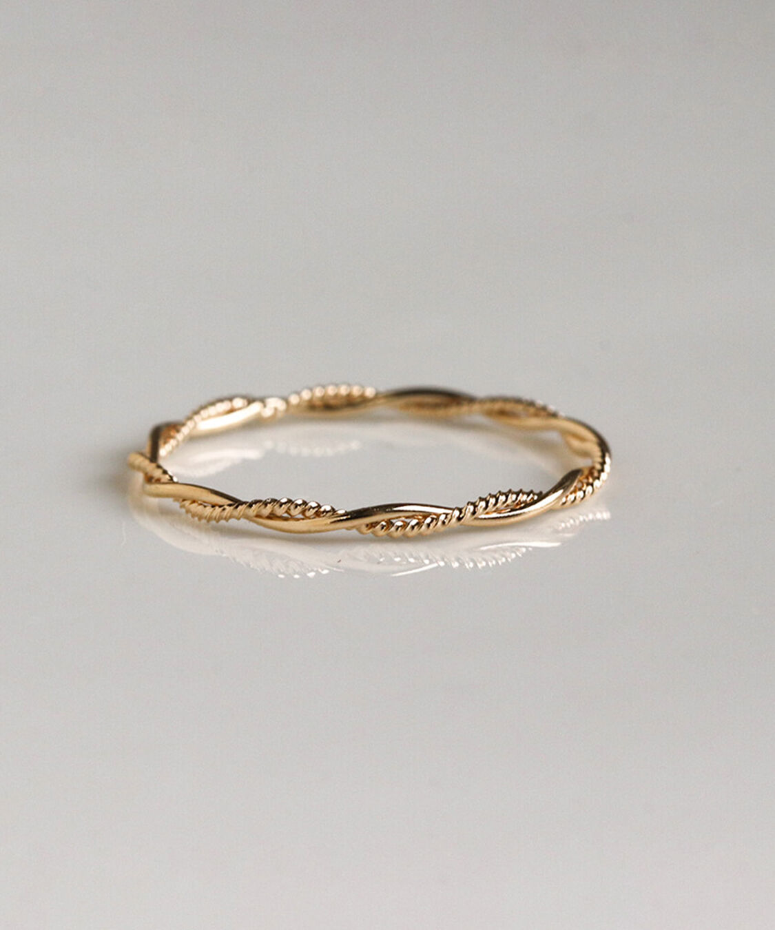 2本の異なるゴールドラインが織りなす、編み込みデザインのゴールドリング。 なめらかなラインと、表情のあるロープラインの組み合わせは細身ながらも奥行きのある表情を生み出します。 重ね着けを.. |