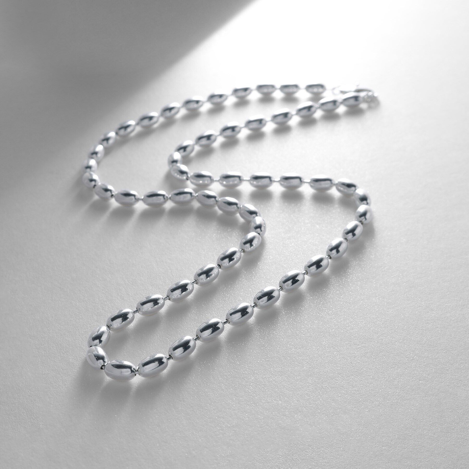 デザインチェーンを使用したオーバルボールネックレス。オーバル形のボールチェーンのネックレスは、重厚感があり目を惹くデザイン。オーバル形のボールチェーンだから大人っぽいコーディネートに.. |