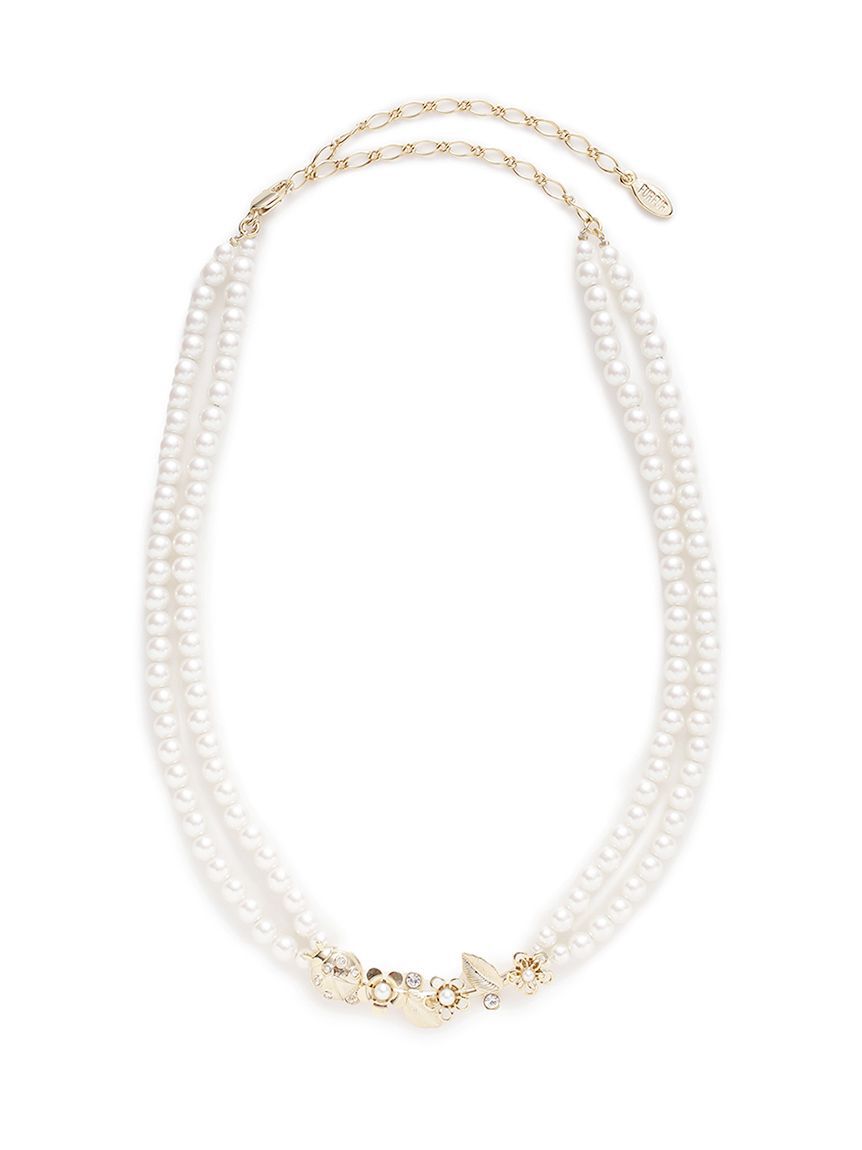 パール部分が二連になった上品なネックレスに草花やテントウムシのモチーフを添えた華やかなデザイン。赤や黄色の彩色が映えるミックスカラーとシンプルな薄金の二種類を展開。襟付きにも合わせや.. |