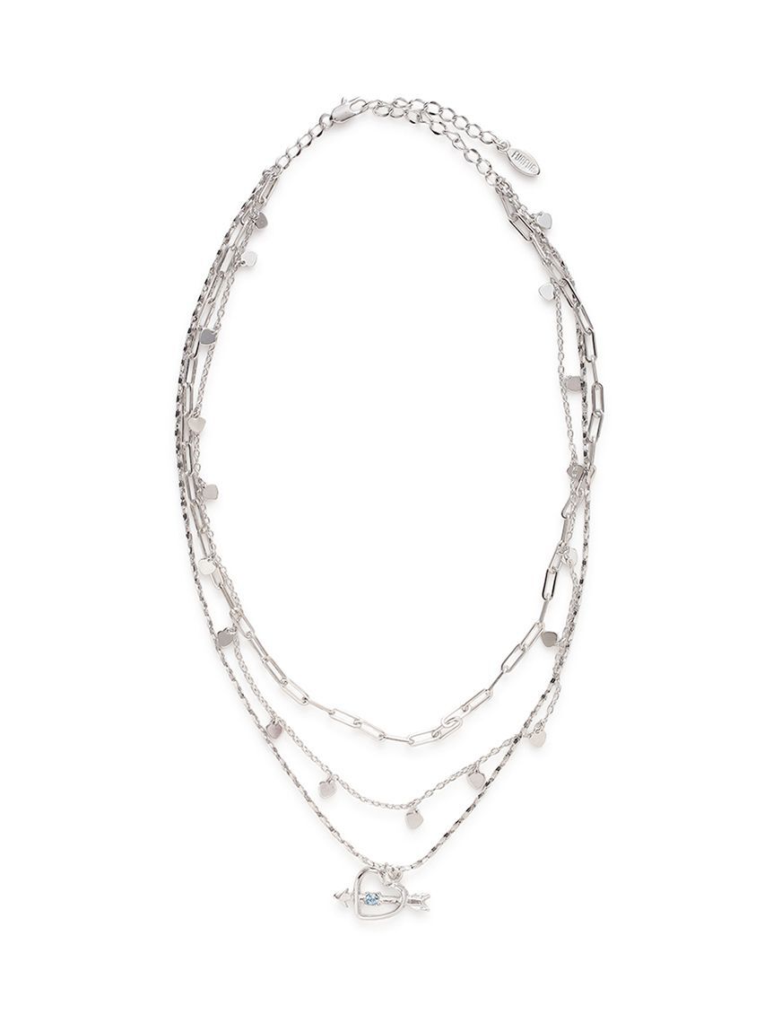 異なるデザインと長さのチェーンを組み合わせた三連ネックレスは華奢さと存在感を兼ね備えたアイテム。小さなハートが連なるチェーンや矢の刺さったハート形のチャームにクリスタルを添えたデザイ.. |