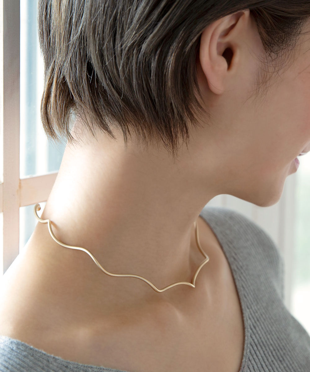 フリルのようなウェーブラインが特徴のメタルチョーカー。個性的なフォルムですが、肌なじみのよいマットなお色味なので落ち着いた印象に。デコルテの開いたお洋服はもちろん、タートルネックなど.. |