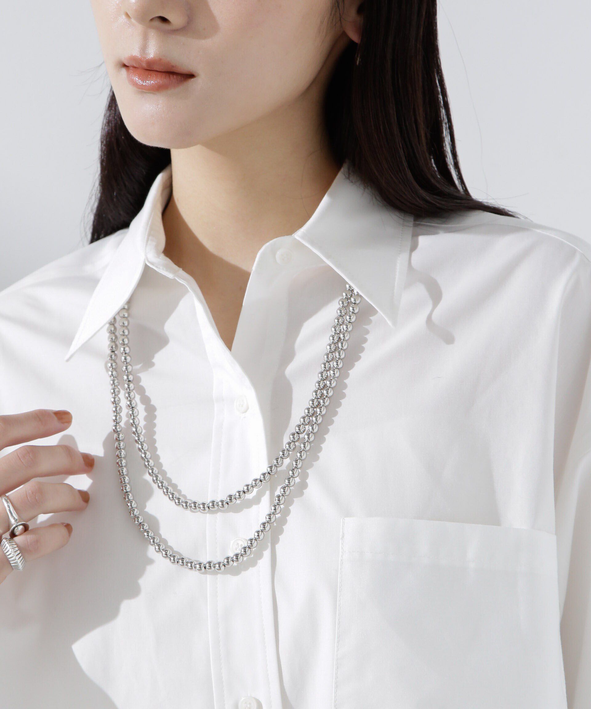 【2025AW】LaTotaliteデイリー使いにピッタリな、LaTotaliteオリジナルのパールネックレス。2連にもできるコーデやシーンに合わせて着用出来る仕様です。カットソーに合わせたカジュアルなスタイル.. |