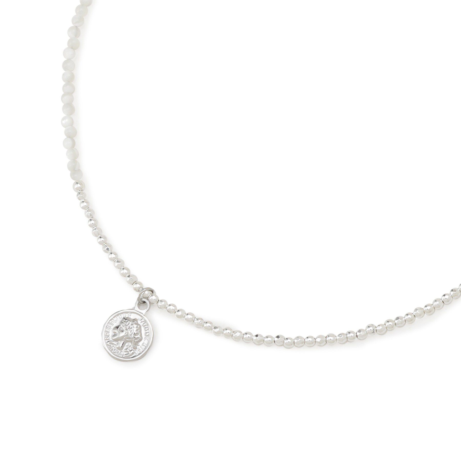 【デザイン】コインモチーフのトップが視線を集めるショートネックレスです。首回りには天然石やガラスをあしらい、透明感のある輝きが涼しさと華やかさをプラスします。短めのレングスがデコルテ.. |