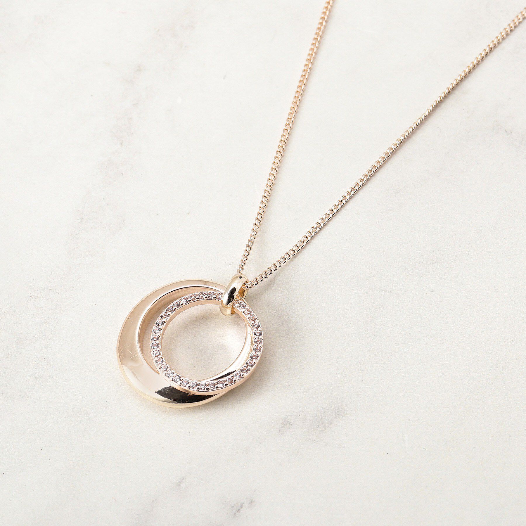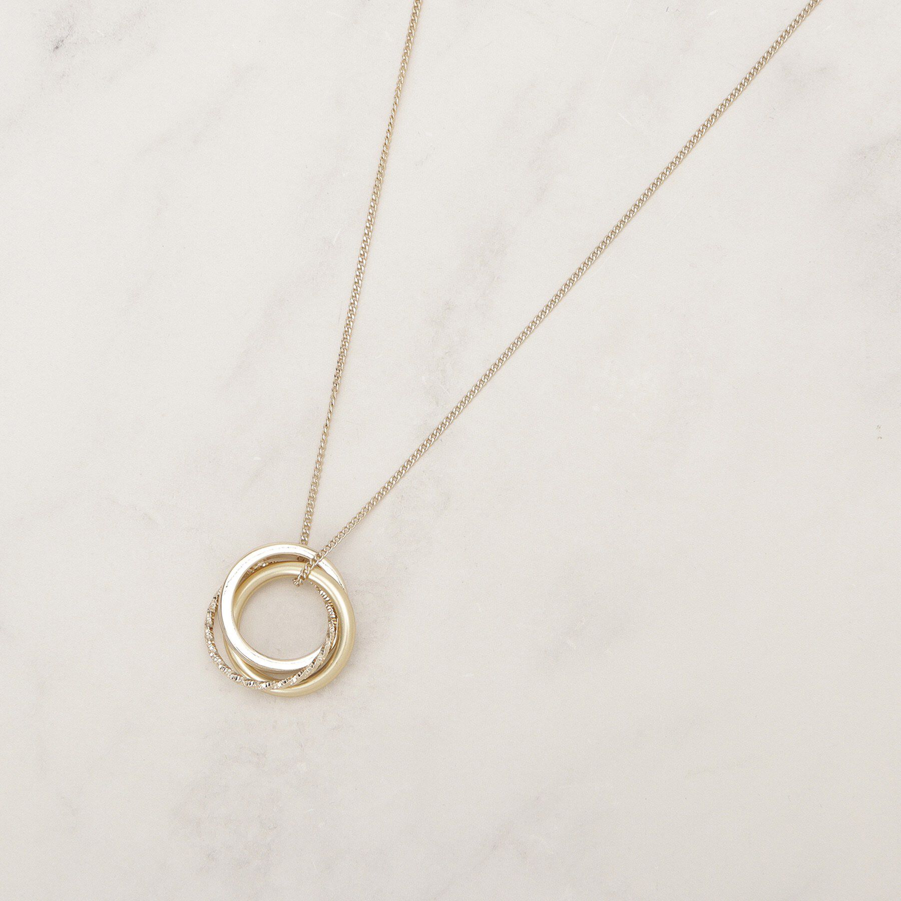 上品なカラーのエポカラーリングが胸元で揺れるネックレス。【デザイン】ニュアンスの異なるメタルリングを組み合わせたリングデザインのネックレス。マットな質感のリング、テクスチャー感のある.. |