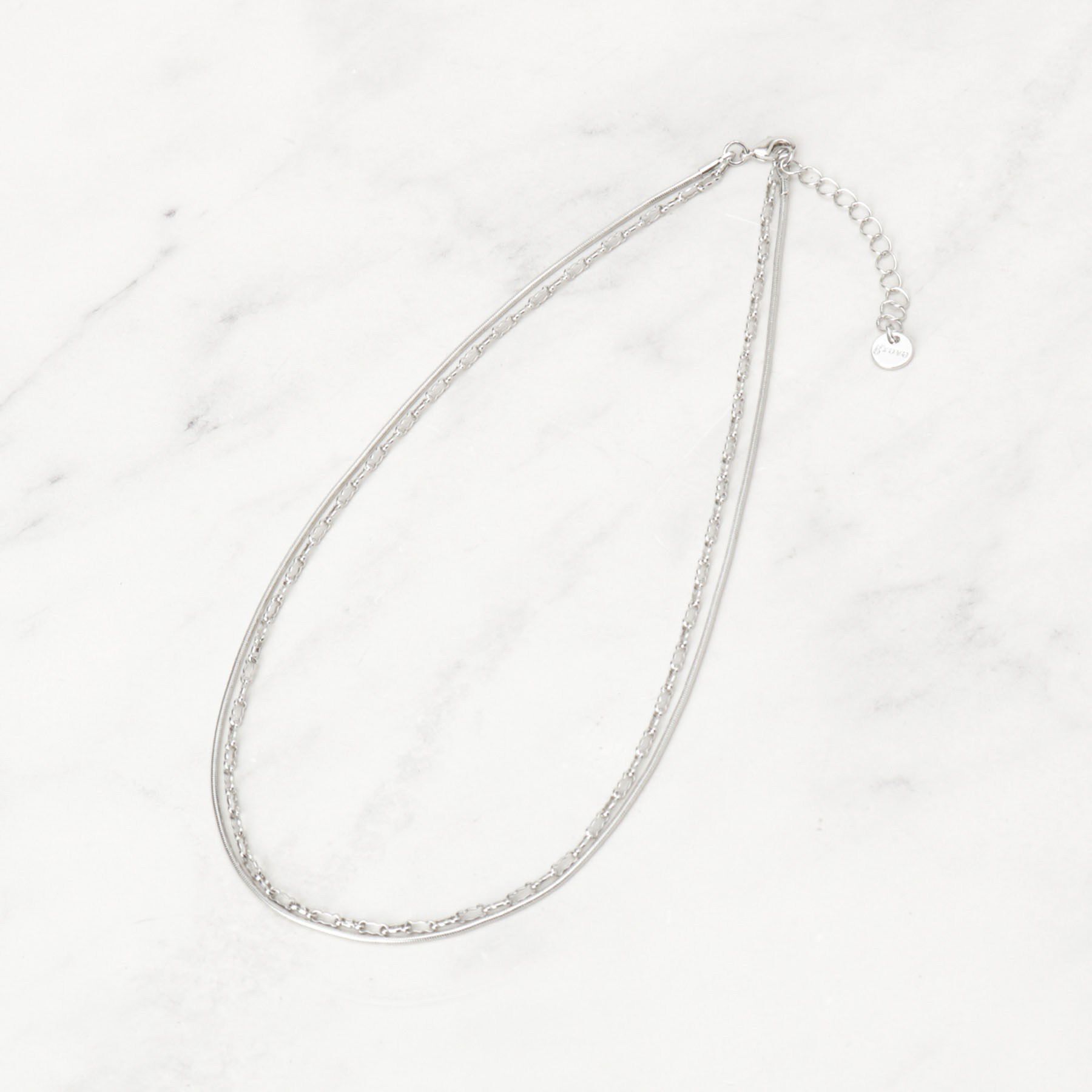 Design Point上品な二連デザインのレイヤードチェ−ンネックレス。カジュアルスタイルからきれいめスタイルまで、幅広いコーディネートに合わせられます。 ※照明の関係により、実際よりも色味が違っ.. |