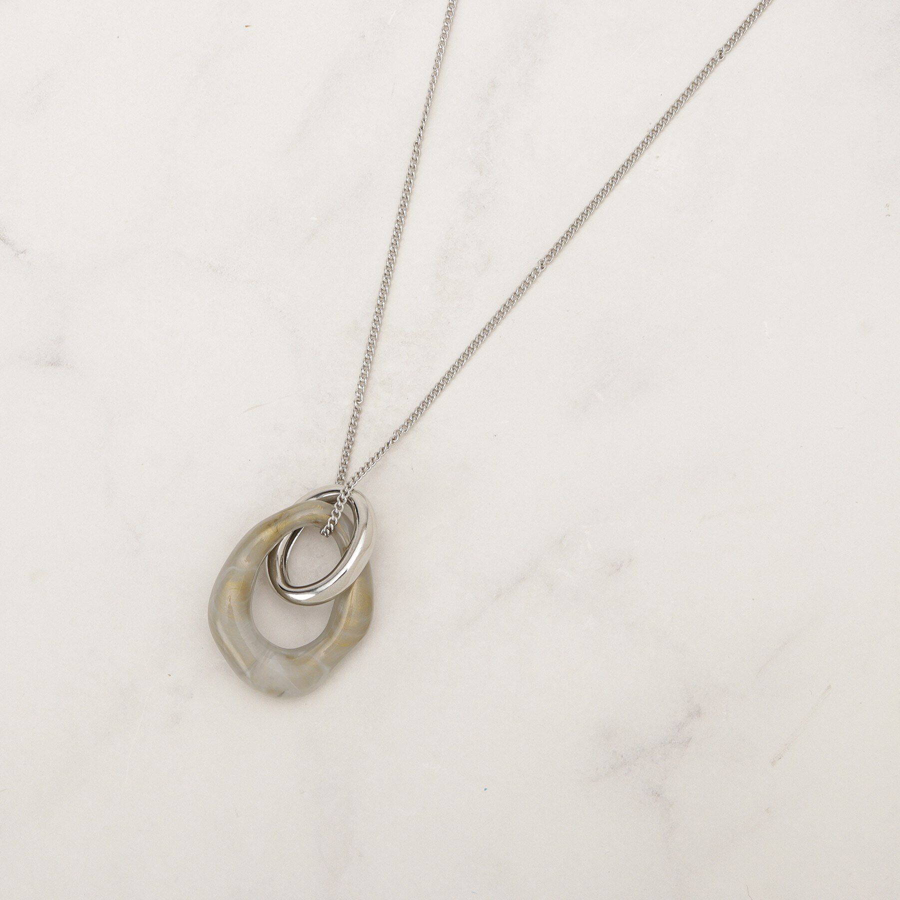 マーブル柄のアクリルリングとメタルリングを組み合わせたネックレス。【デザイン】使いやすい長さのネックレスに、メタルリングとニュアンスのあるマーブル柄リングを組み合わせたネックレス。優.. |