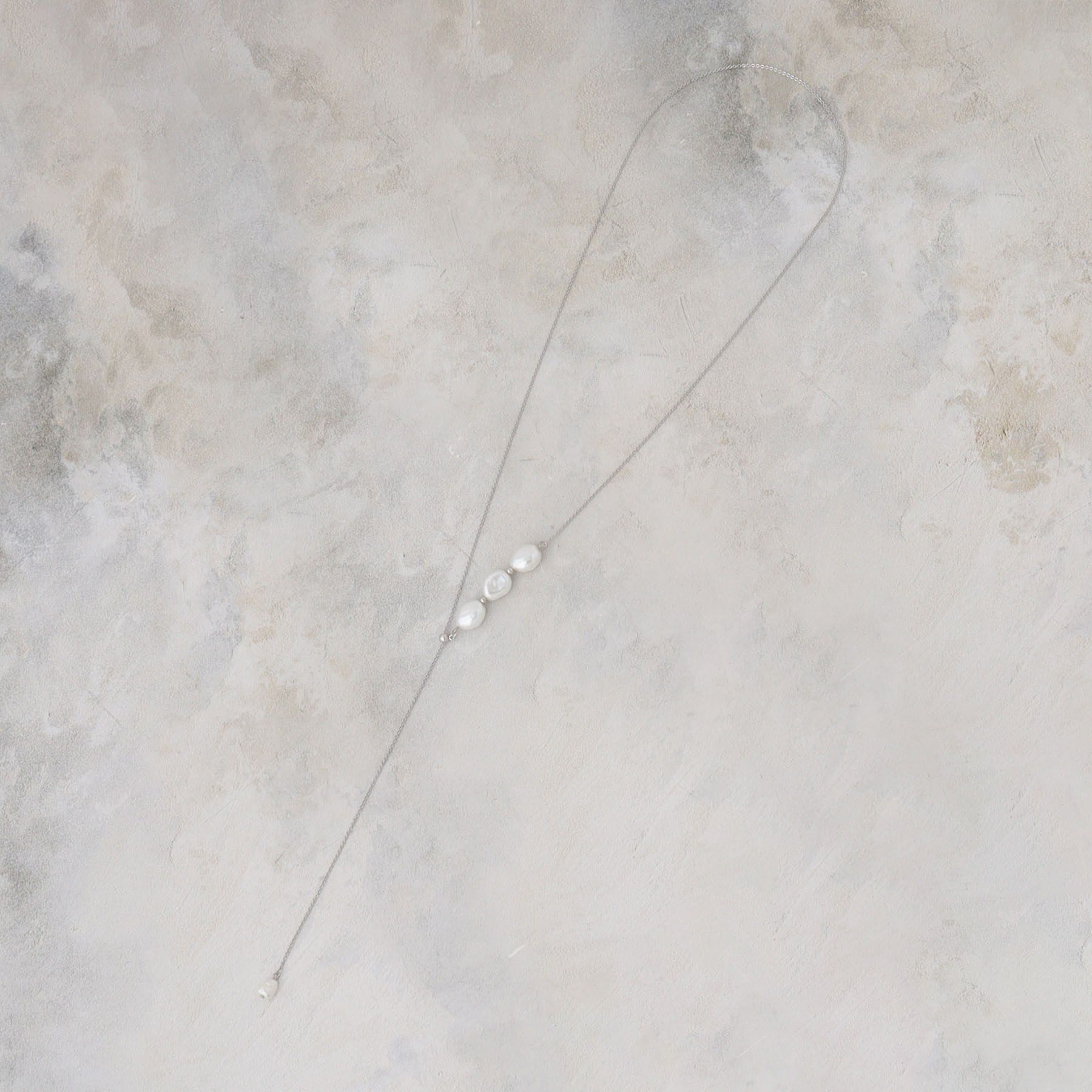 3連のパール調ビーズがとても上品で長さ調節しやすいスライド式ネックレス【デザイン】3粒配したパール調ビーズが程よいボリュームを生み、スライド式の留め具で長さ調整できる上品な佇まいです。.. |