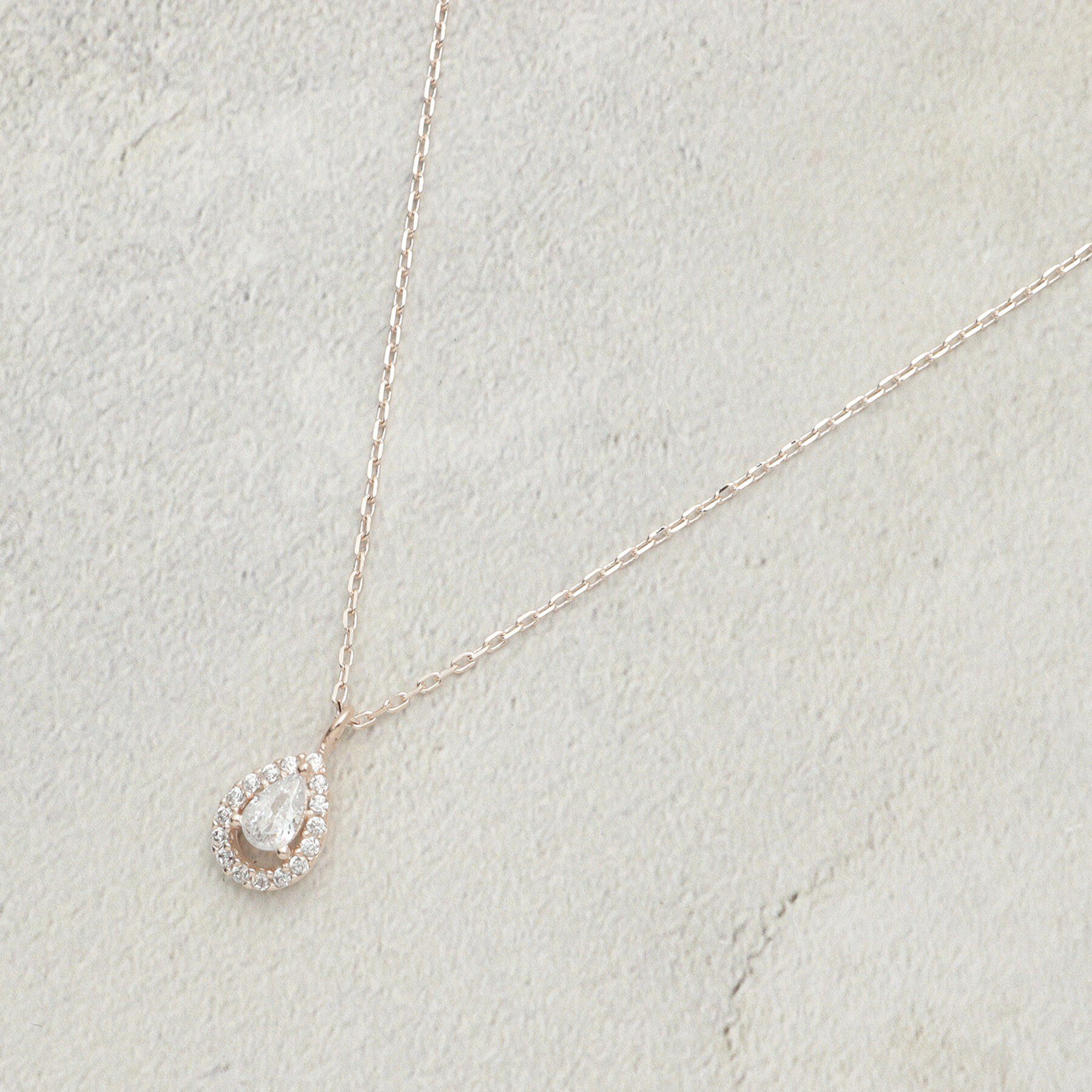 ミニビジューが上品などんなスタイリングにも合わせやすいネックレス【デザイン】小さなしずくモチーフにミニビジューを配し、控えめに光る上品なネックラインを演出。【着こなしポイント】Vネック.. |