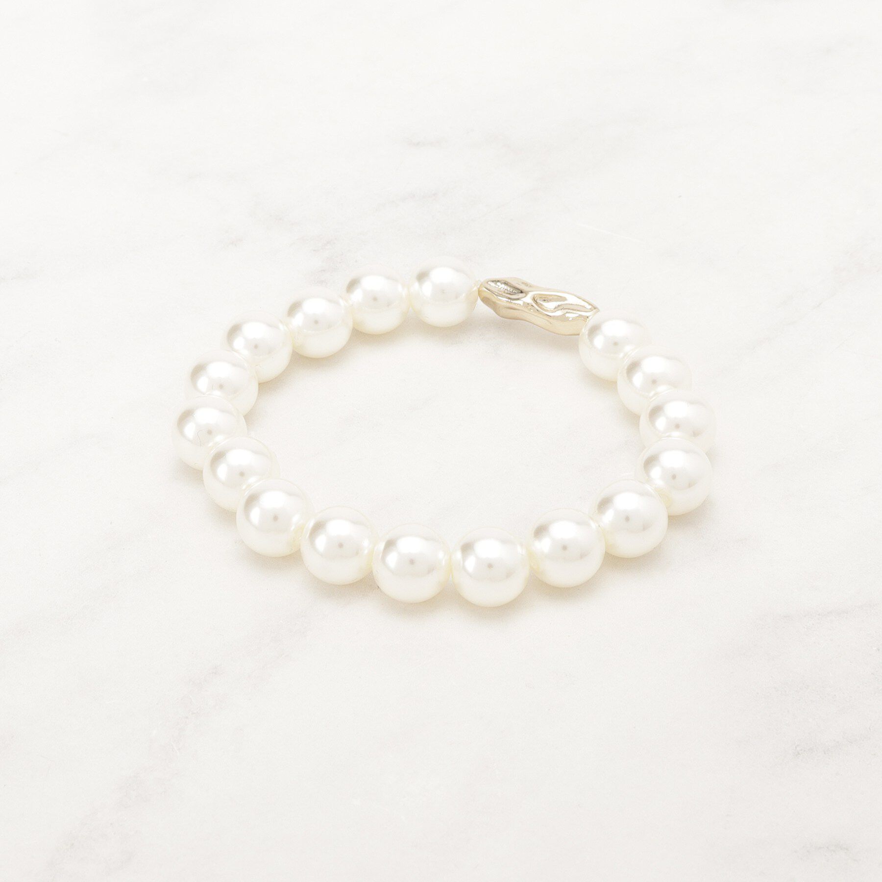ボリュームのあるフェイクパールにメタルモチーフをセットしたブレスレット。【デザイン】フェイクバールのシンプルなゴム仕様のブレスレットに、ニュアンスのあるメタルパーツをセットしたアイテ.. |
