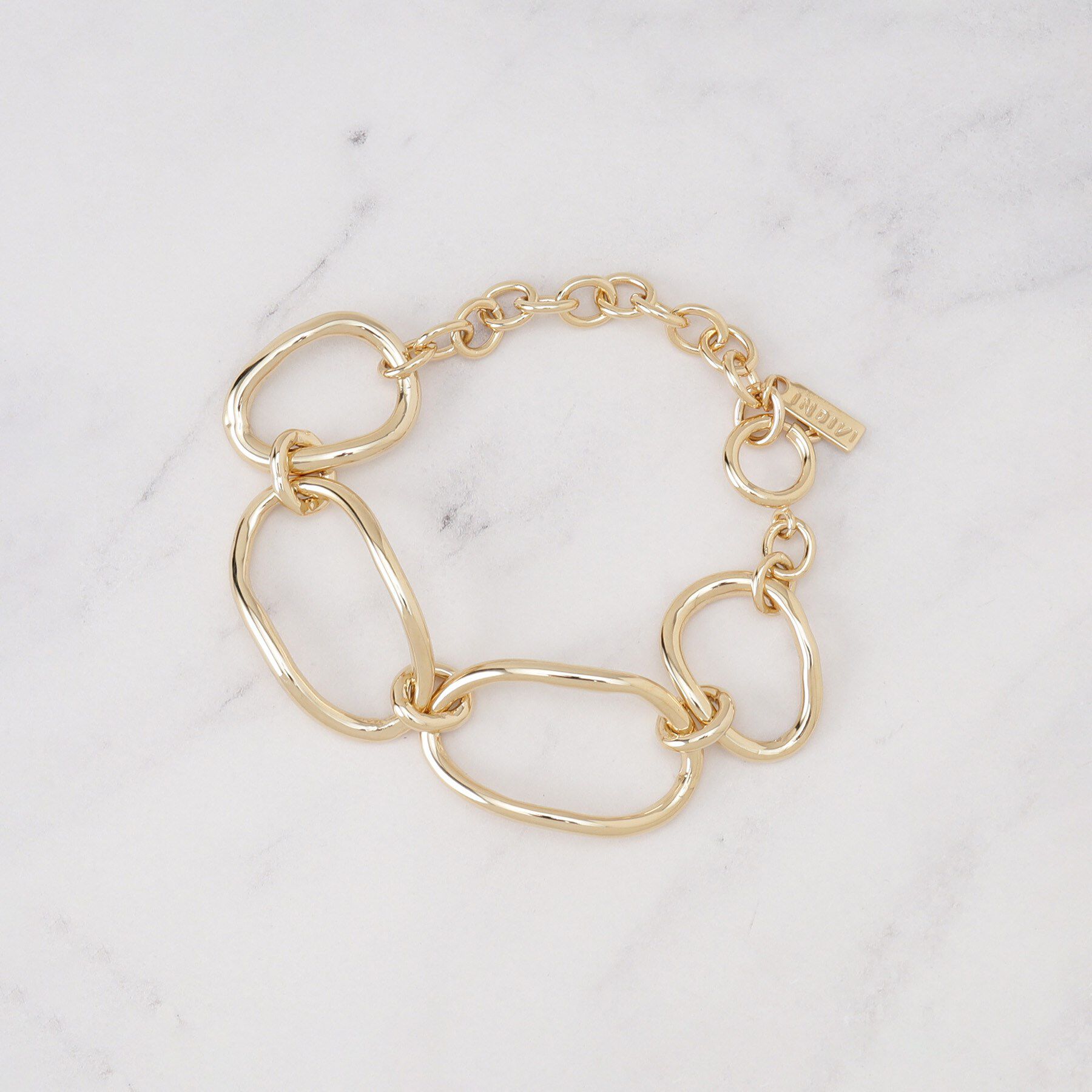 ニュアンス感のあるメタルチェーンのブレスレット【デザイン】ユニークな変形チェーンが特徴のメタルブレスレット。流れるようなラインが手首を美しく引き立て、シンプルながらも存在感のあるスタ.. |