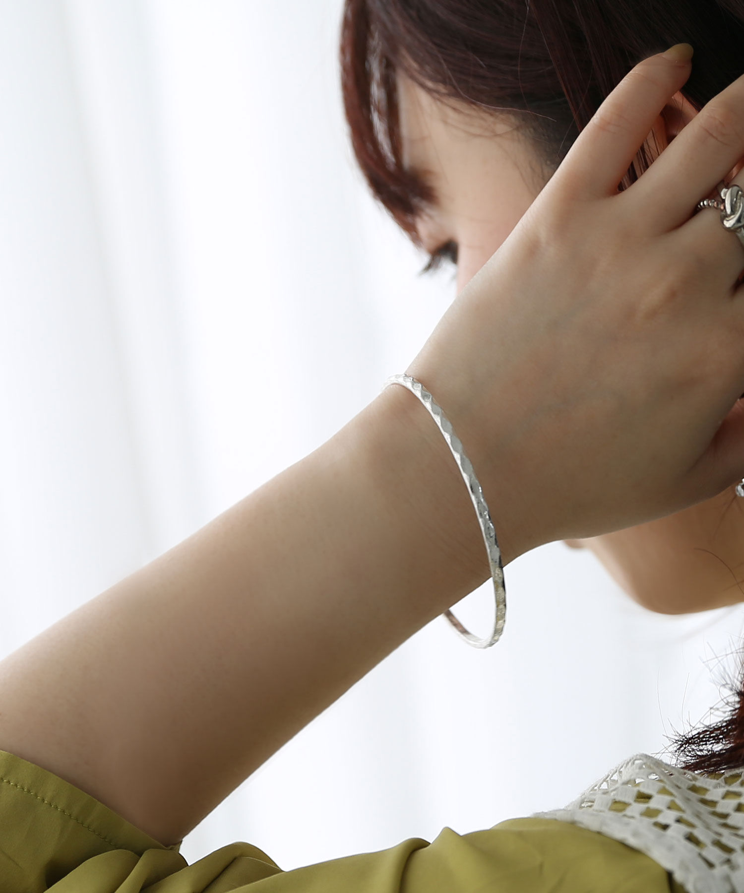 【アンティークのような渋みのあるメンズライクデザイン】陰影のある槌目加工を施した円状のクローズバングル。細めのラインで手を通しやすく、お手持ちの腕時計やブレスレットの重ね着けにもおす.. |