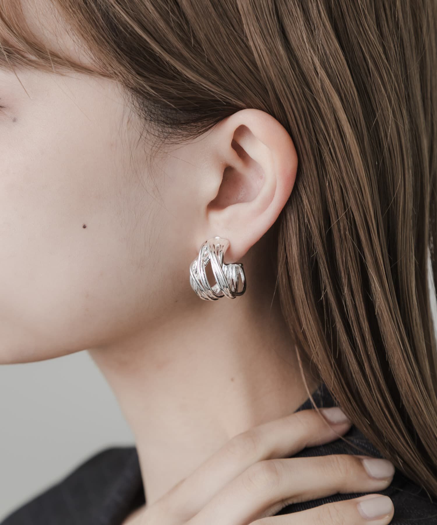【ラインを重ねたボリューミーなルックス】●ランダムな重なりが織り成す繊細さ●耳たぶを包む湾曲シルエット●シルバーメタルでクールな印象華奢なメタルラインを重ね合わせてボリュームを出した、ワ.. |
