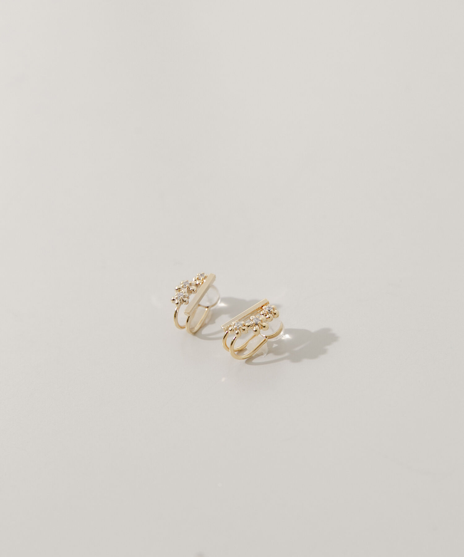 【耳元に可憐な花を添える】●小さなビジューが集まってできたフラワーモチーフ●シャープなメタルバーと並んだ、甘すぎないレイヤード風デザイン●耳たぶに収まる華奢なサイジング極小のビジューを寄.. |