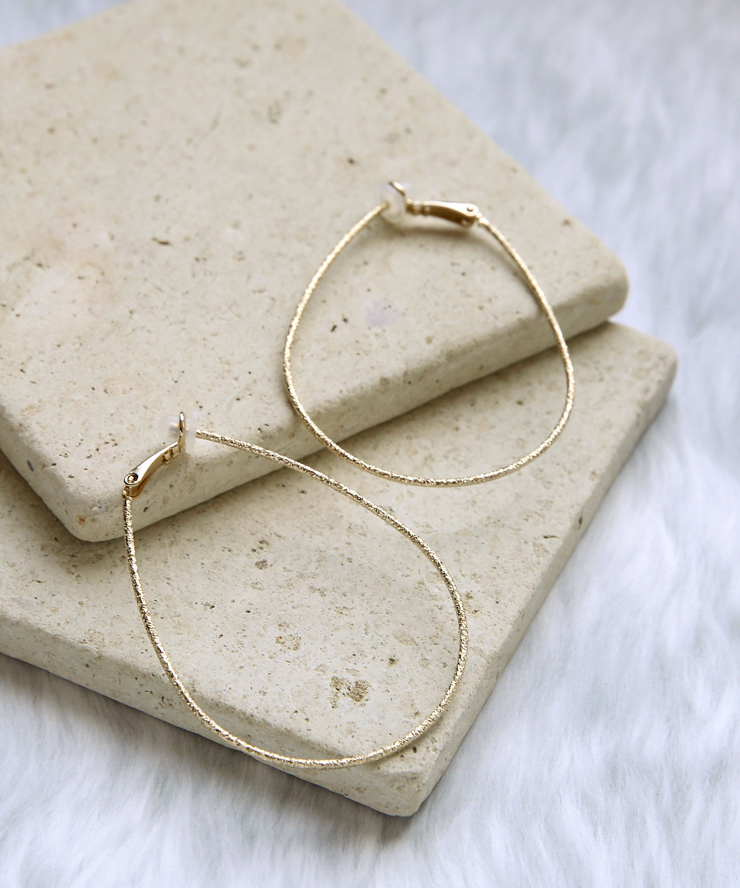 ねじりを効かせた樹脂ノンホールタイプのフープイヤリングです。大きすぎない使いやすいサイズ感。ねじれ部分には細かく槌目加工を入れ、シンプルながらも小ワザの効いたデザインに仕上げています.. |