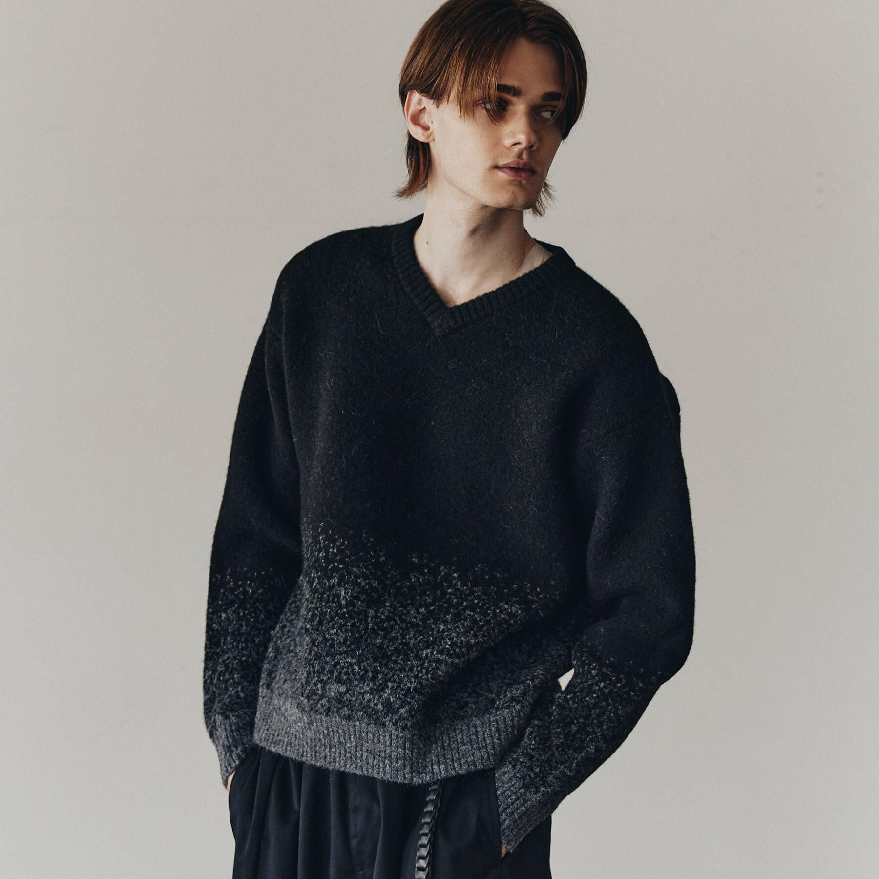【素材】甘撚りのポリエステルベースの糸に少し毛を混紡しています。糸:5ゲージ【デザイン】バイカラーでグラデーション柄を表現した浅Vネックのニットです。トレンドの浅Vネックは、インナーにT.. |