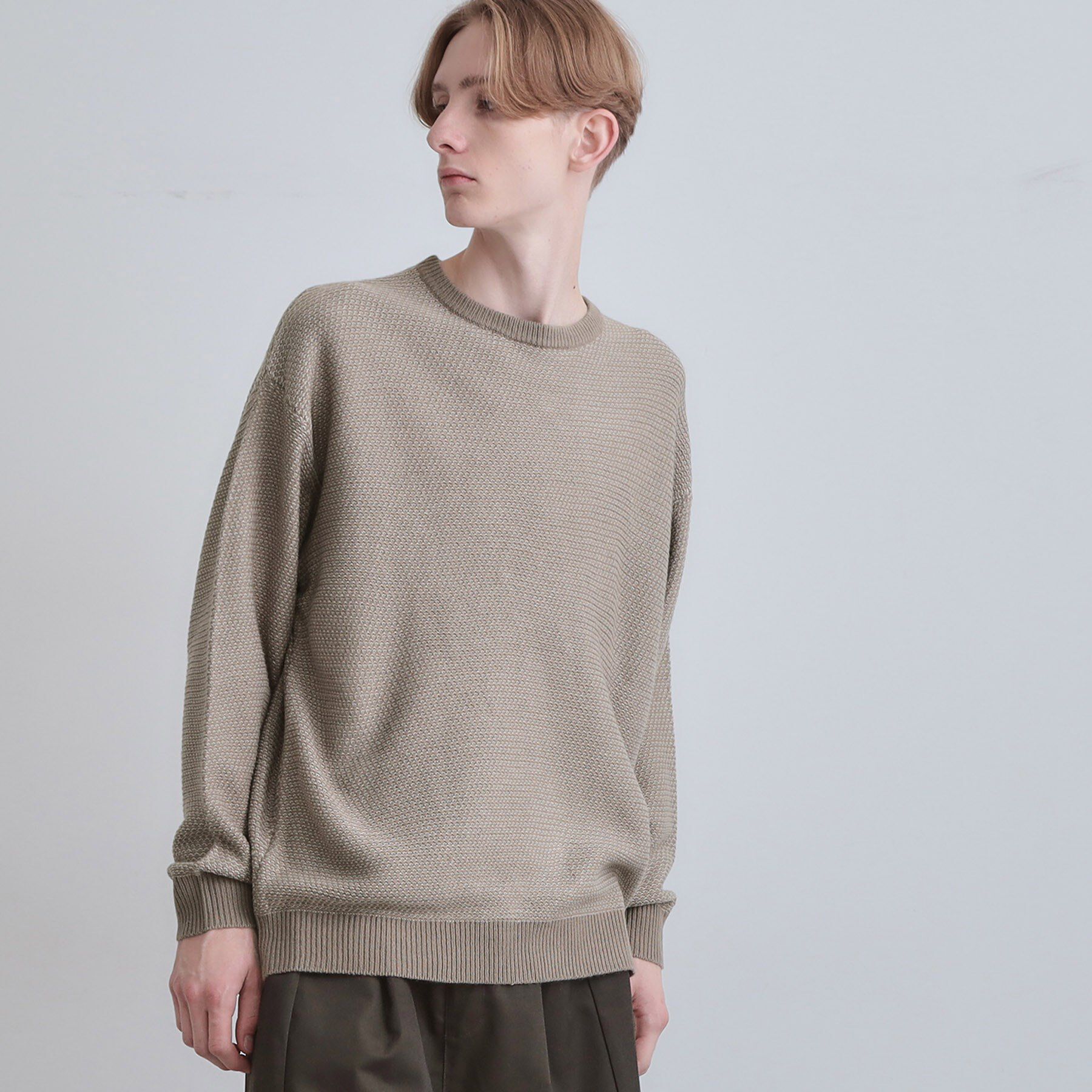 【素材】バルキー素材を使用し、膨らみがあり軽くて暖かい素材を使用しています。起毛感がありながら厚すぎず、程よい肉感に仕上げました。【デザイン】鹿の子調の柄を2色使いで凹凸感のある編地に.. |