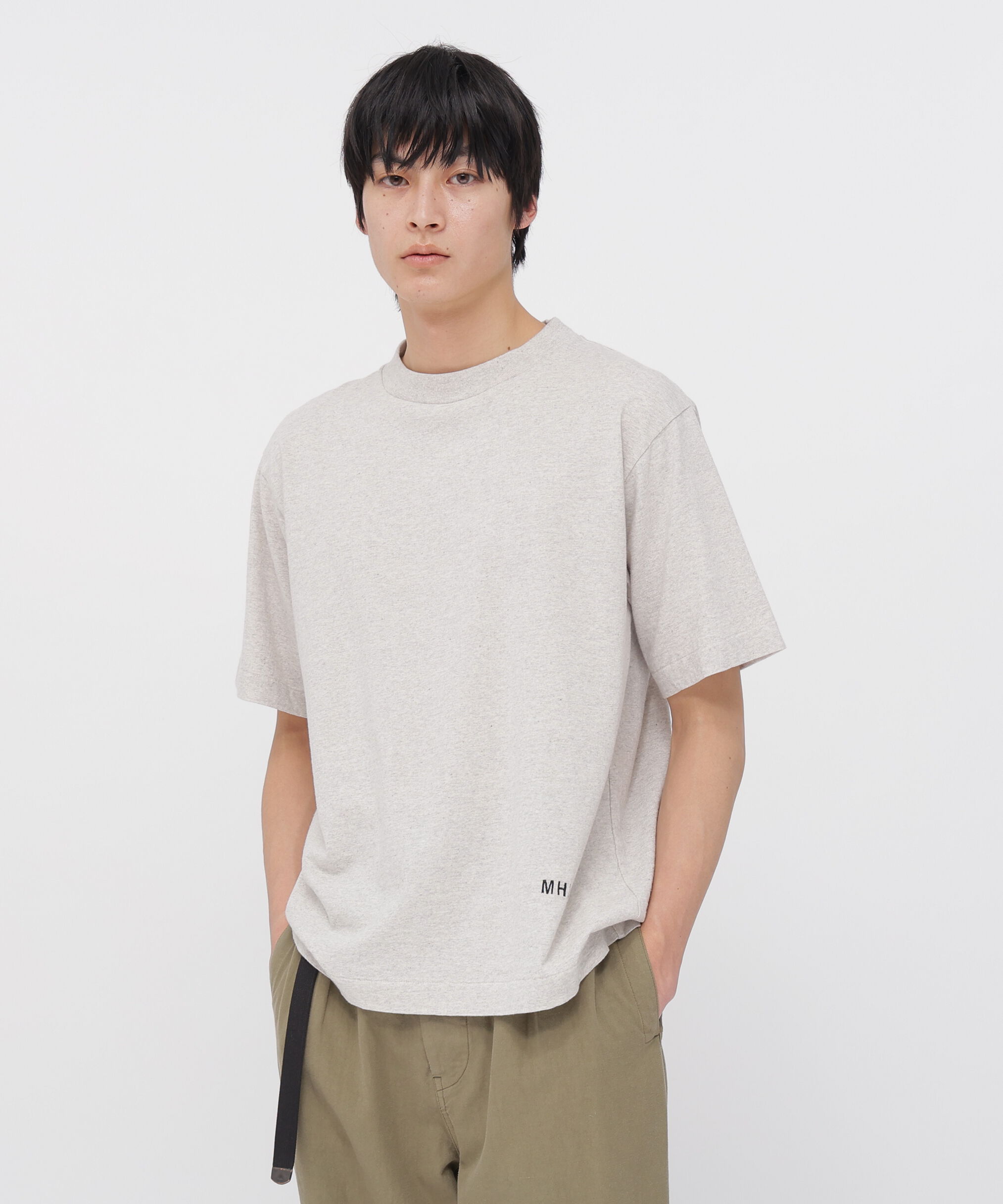 コットンとリネンを用いたジャージー素材のTシャツ。ドライなタッチのコットンとリネンのシャリ感が合わさった清涼感のある風合いが特徴で、度目を詰めて編み立てることでMHLらしいタフな素材感に.. |