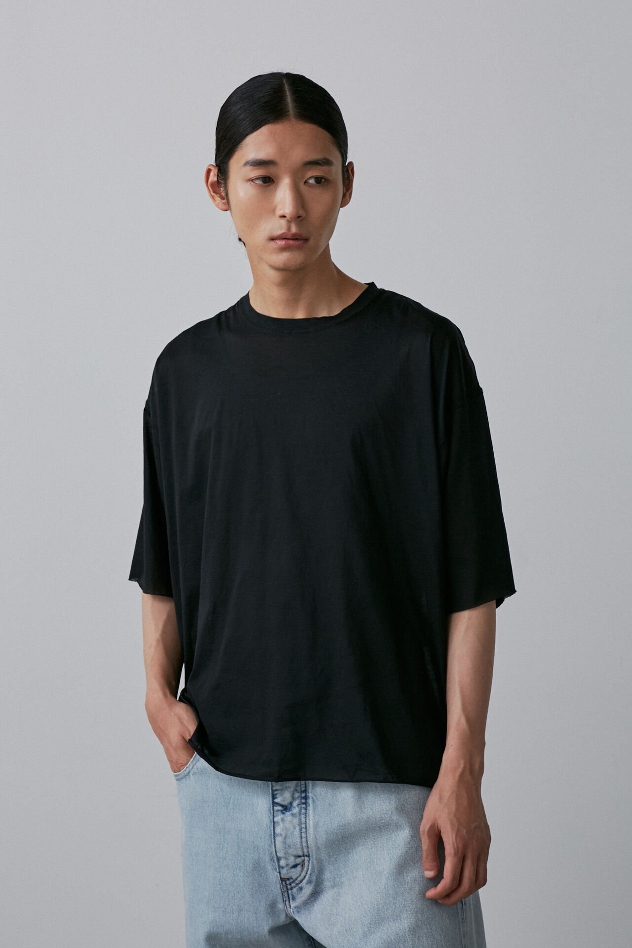 オリジナル紡績のインド超長綿原料をハイゲージに編み立て、恒久性の高いシルケットを掛けたシアー感のある軽い素材に仕上げました。ゆったりしたTシャツは、袖口と裾が切りっぱなしの仕上げです。.. |
