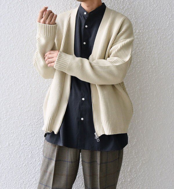 アウターのような使い方もオススメ!Vネックのジップカーディガン【素材特性】たっぷりとした肉感が出る5ゲージの畦編みニット。贅沢に目付を入れたニットは、しっかりとした肉感とモチモチした触.. |