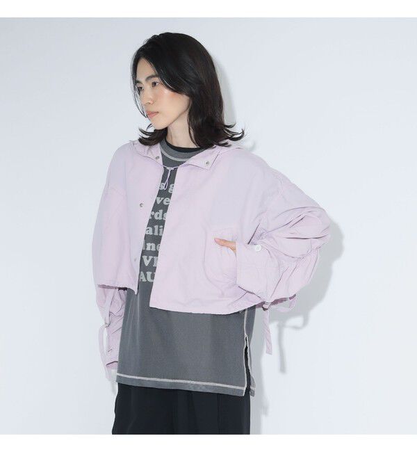 ■デザインリサイクルナイロンを使用した、ミリタリーディテールが映える軽量ショートブルゾン。フード部分のクロスベルトや脇下に配したベルトは、袖を持ち上げる実用性と、計算された垂れ感による.. |