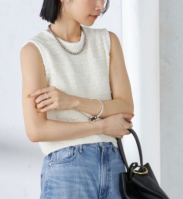 ―24FW―コンパクトなシルエットが今年らしいツイードベスト■デザイン様々な表情の糸を使用し、ツイード見えするベスト。伸びの少ない編み組織なので、ハンガーに掛けた時の型崩れがしづらいのが特徴.. |