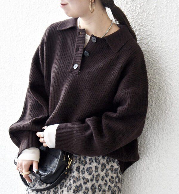 【25AW】カシミヤ5%混の柔らかな紡毛糸AQUAを使用した、人気のニットシリーズが今年も登場!〈デザインポイント〉襟付きのポロシャツデザインが新鮮な、片畦編みのニットプルオーバー。胸元のボタ.. |