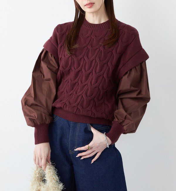 ■25AW■スタイリングの主役になる、ドッキングニット。-デザイン-レイヤードをしているようなデザインのドッキングニット。変形のケーブル編みが秋冬らしさを演出。袖は素材違いの切り替えになって.. |