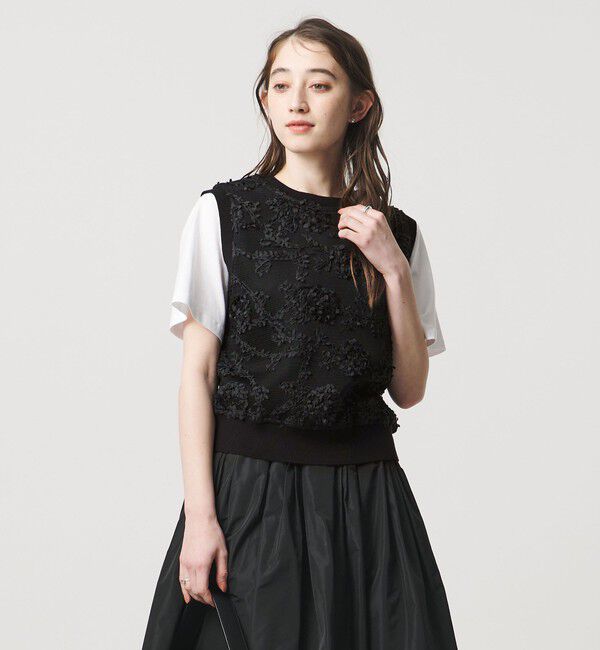 刺繍の立体感が映える、レイヤード上手なニットベスト■デザイン刺繍テクニックで加工した生地を使用した、華やかな印象のニットベスト。程よくゆとりがありつつコンパクトなサイズ感です。アームホ.. |