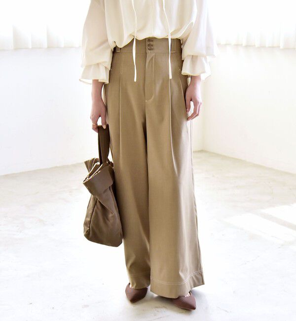 2026SSquaranciel●デザインウエストのボタンディテールがモードな雰囲気のある、ハイウエストのワイドパンツ。太めのベルト部分とフロントに施した深めの2タックで、腰周りや太ももにゆとりを持た.. |
