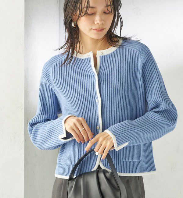 ―26SS―オンオフで主役になる配色ラインがワンポイントになったリブカーディガン■デザイン配色ラインが目を引くニットジャケットです。刻みが細かく入ったシルバーメタルボタンがデザインポイントに.. |