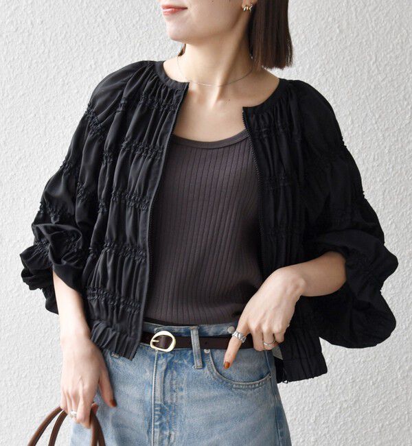 【26SS】〈デザインポイント〉ショート丈のシアーブルゾン。袖口と裾はゴム仕様で、シャツ感覚でさっと羽織れる軽やかな着心地に仕上げました。全面にフリルを施したシャーリングのようなデザイン.. |
