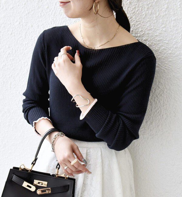 【26SS】〈デザインポイント〉配色デザインが目を惹く、コンパクトなリブニット。裾と袖口の控えめなフリルとバイカラーが、シンプルながらも遊び心のあるデザイン。程よくフィットするサイジング.. |
