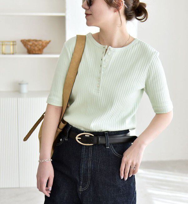 2026SSquaranciel一枚着からインナーとして汎用性の高いリブTEE●デザインクルーネックとヘンリーネックの前後2wayで着られる、ハーフスリーブのプルオーバー。五分袖で気になる二の腕をカバーしつ.. |