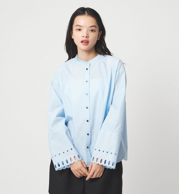 袖のスカラップレースが華やかなモードに着られるシャツ■デザイン袖のカットワークレースがポイントのシャツ。スカラップレースは甘い印象になりすぎないオリジナルの柄を刺しゅうしています。ピン.. |
