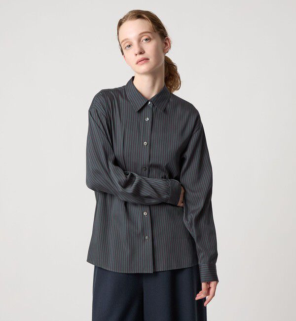 落ち感のある素材を使用した、ストライプシャツ。ミニマルなレギュラーカラーのデザインです。やや身幅を持たせたゆとりのあるシルエットながら、繊細な素材感がエレガントさをプラス。一枚着はも.. |