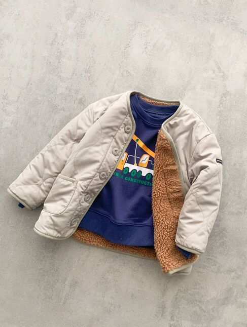 【デザイン&ディテール】キッズ向けリバーシブルボアブルゾンは、ミリタリーテイストの洗練された仕上がりが魅力です。ボア側は、ポケット部分に配色を施したディテールがアクセントとなり、遊び.. |