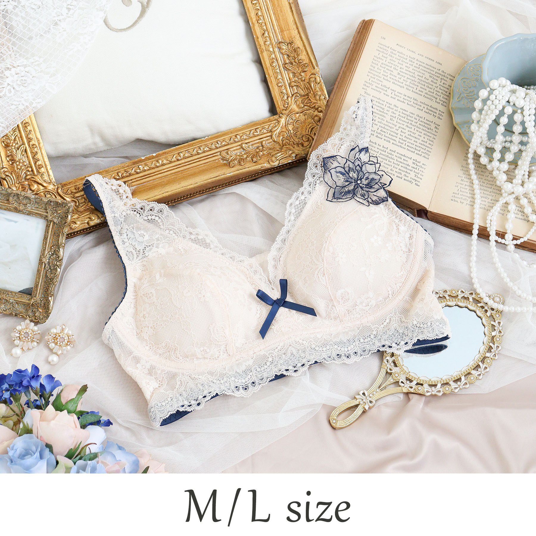 【レースで紡ぐ愛の言葉】優雅なアンティークの世界から生み出された、愛の言葉が散りばめられたシリーズです。おやすみブラはカップ全体を上品なレースで覆い、長く愛せるデザインに。ワンポイン.. |