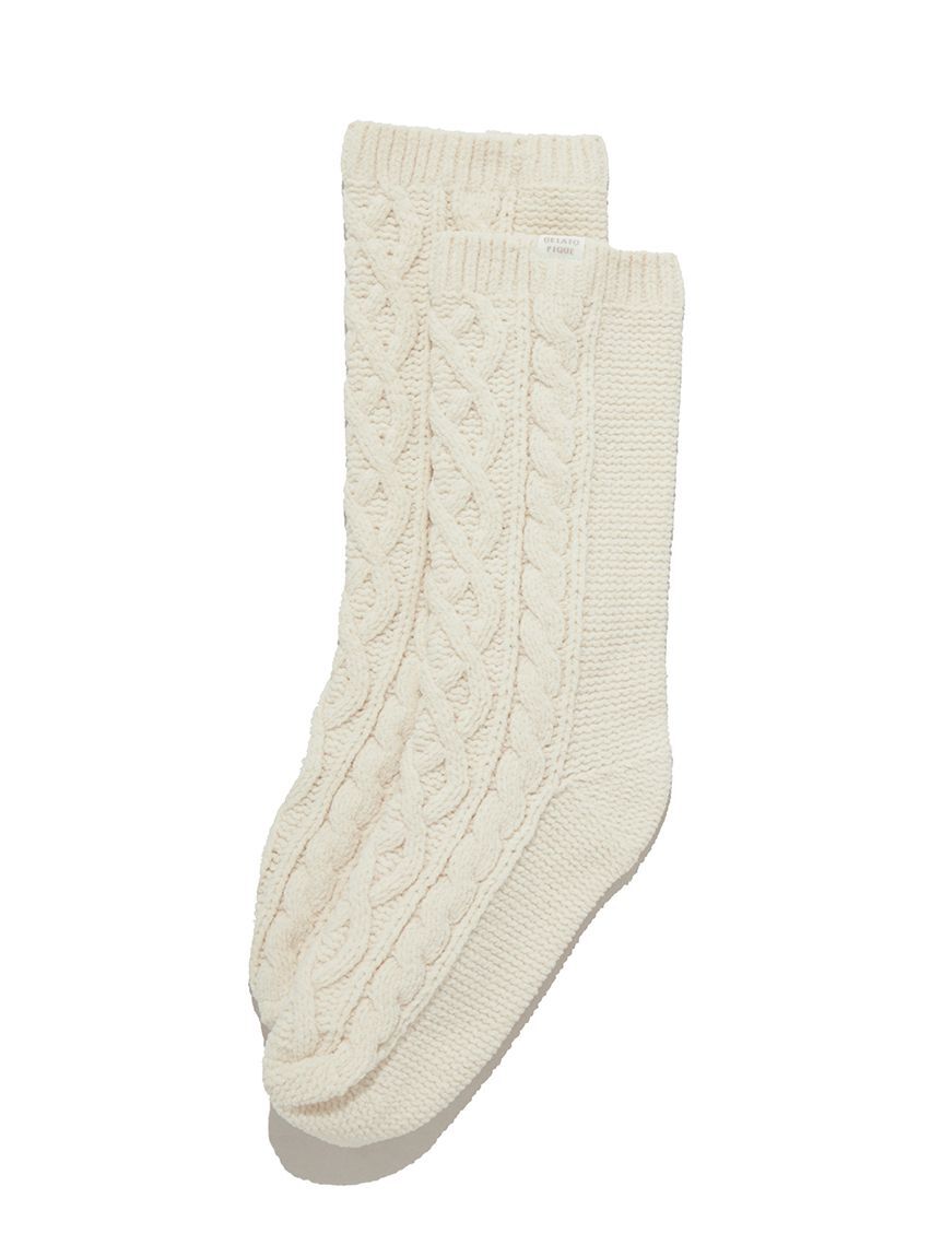 【ふかふかの肌触りが心地良いスフレのアラン柄ソックス】【Fabric】SOUFFLE(スフレ)…スフレを食べた時のふわっ、しゅわっとした舌触りを連想するようなふかふか感。心地よい弾力のある生地です。.. |