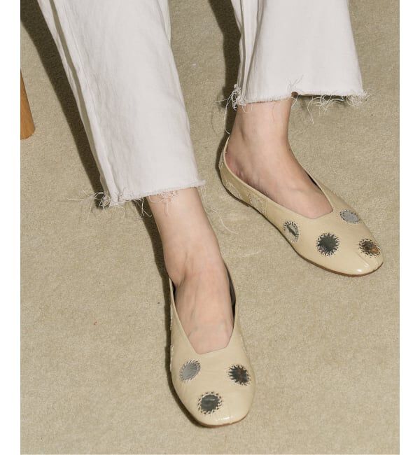 《WEB+一部店舗限定》繊細なミラーワークをアッパーに施したフラットシューズ。ミラー部分は箔レザーを使用し、職人が1つ1つ丁寧にハンド刺繍したこだわりの1足です。クラフト感のあるデザインで.. |