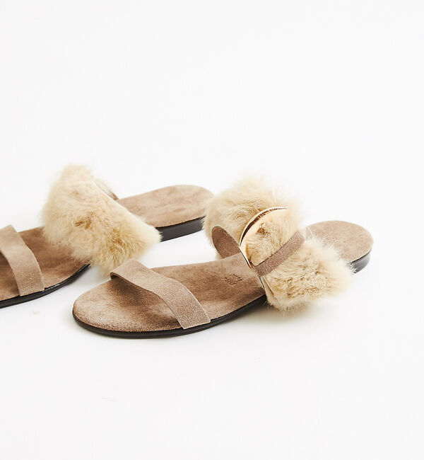 2ベルトフラットサンダルはレザー使いで、大人の抜け感を叶えてくれる一足。太ベルトのラビットファーと大きめのバックル使いがアクセントに。やわらかなインソールのクッションで、履き心地も良い.. |
