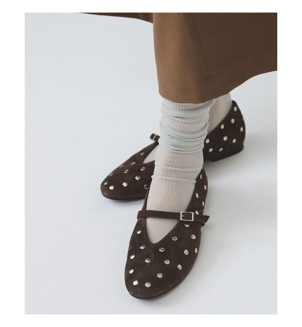 ■デザイン柔らかなスエード素材に、散りばめられたスタッズが目を惹くストラップシューズ。Vカットの履き口が足元をすっきりと女性らしく見せてくれ、フラットシューズながら洗練された印象を与え.. |