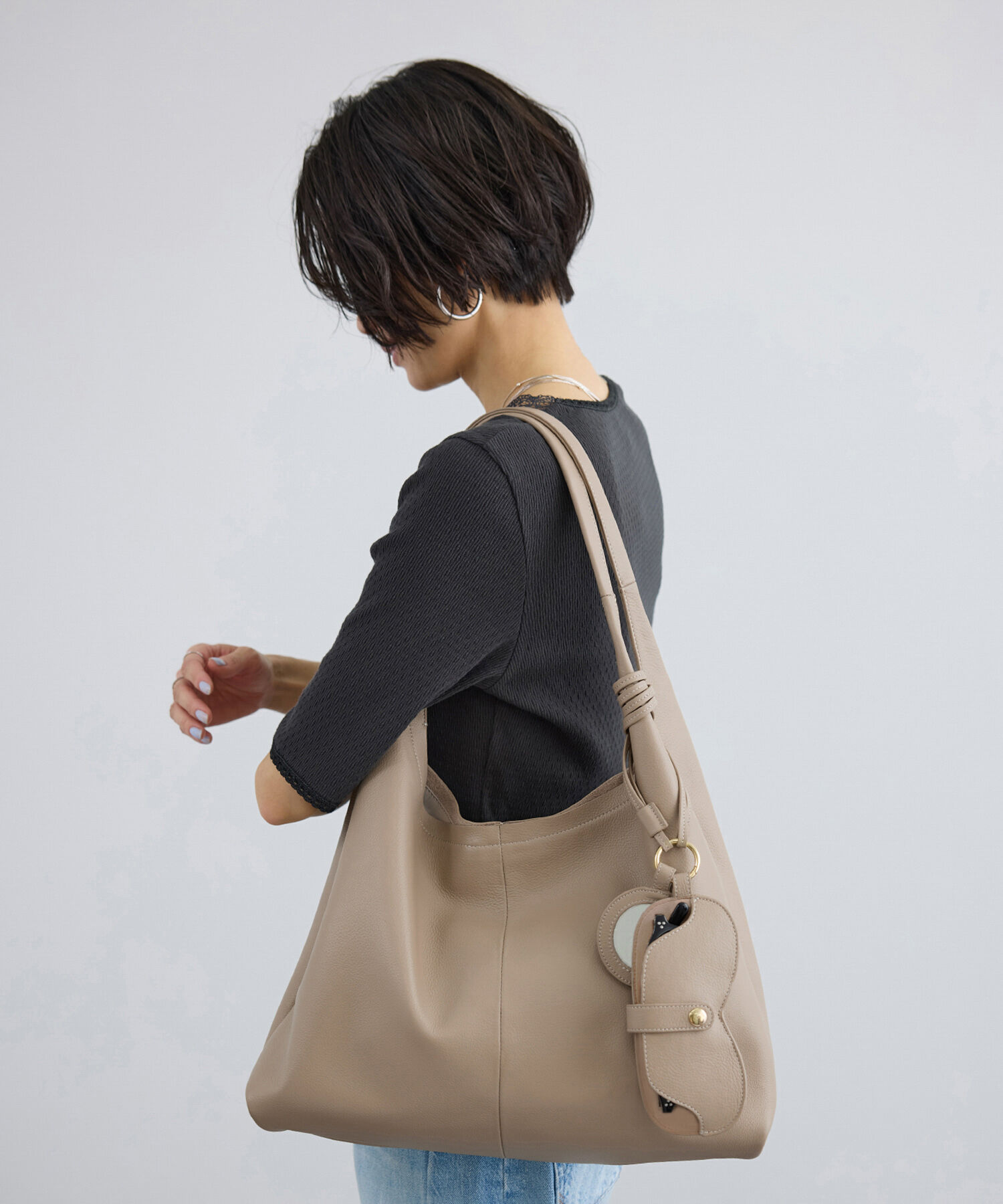 ■デザイン/シルエットリラックス感のあるHOBOシルエットのトートバッグ。取り外し可能なチャームにはサングラスケースとミラーをセットし、リングカラビナとレザーコードで自由にアレンジ可能。首.. |