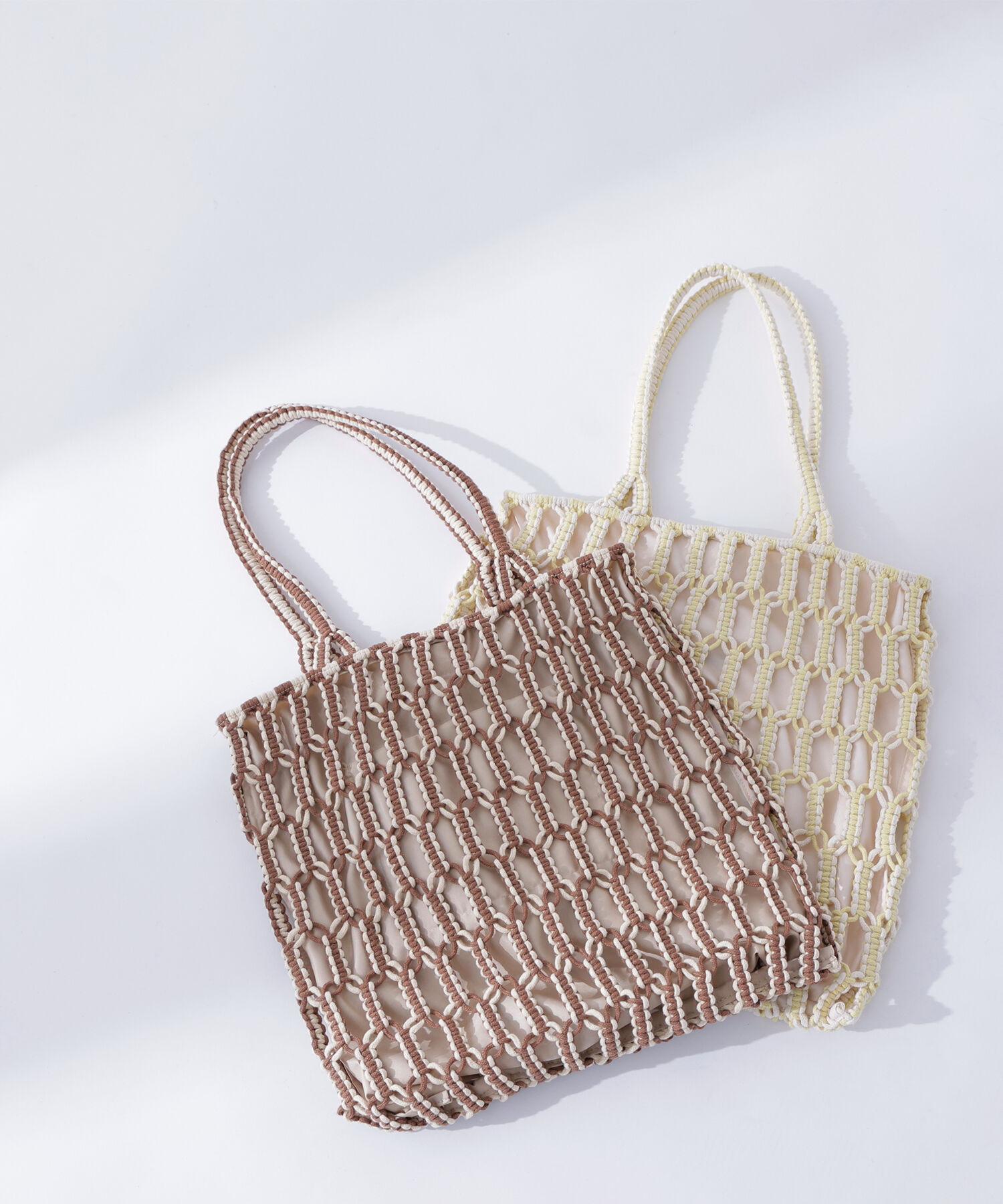 コットン紐をバイカラーでマクラメ編みに仕上げた、70年代ムード漂うトートバッグ。ナローシルエットやワイドなボトムスとも相性の良いバランスです。都会的かつ洗練されたカラーも魅力。A4サイズ.. |