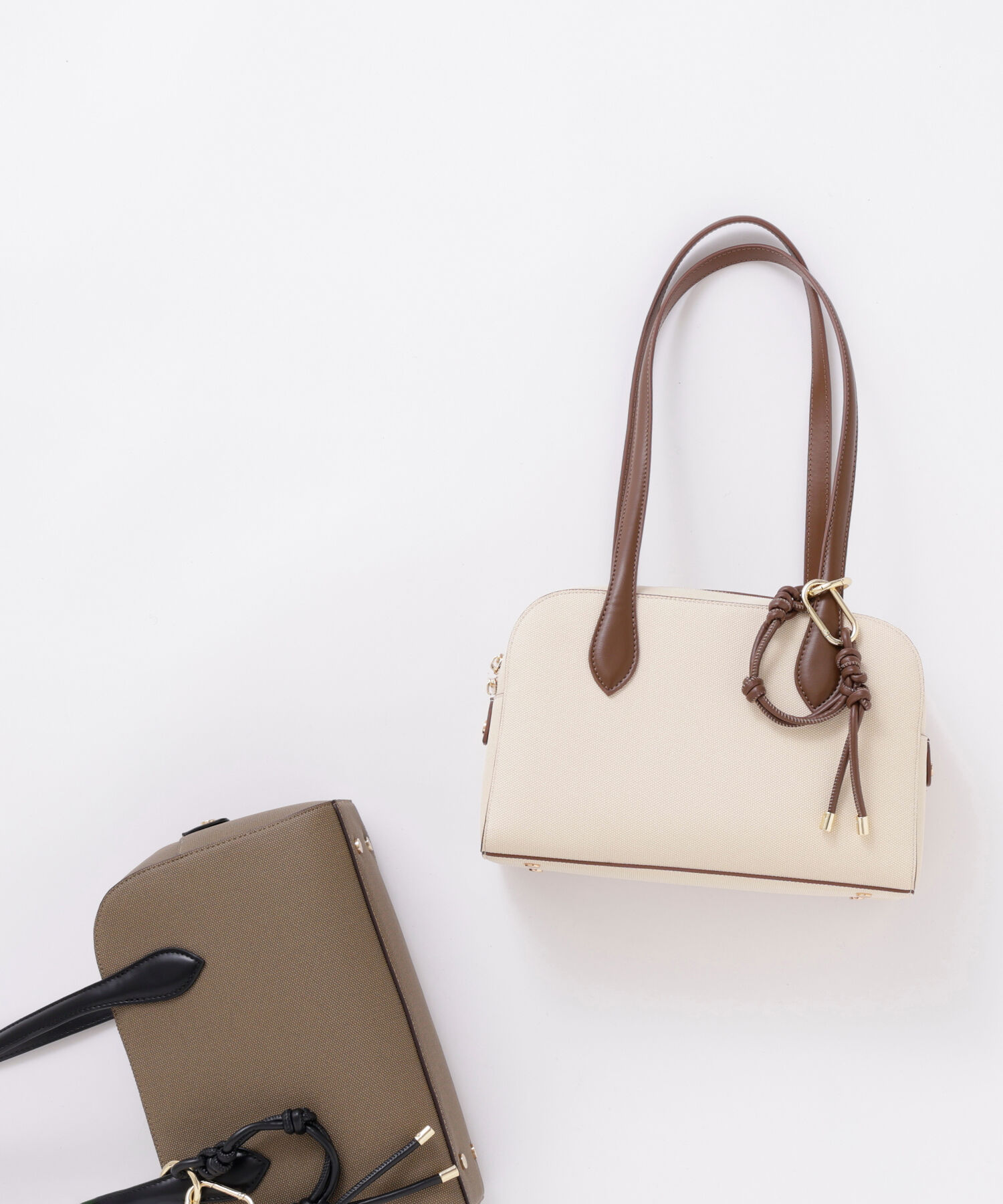 バッグチャーム付きで洗練された印象に見せてくれる、トレンドのフェイクスウェード素材を使用したボストンバッグ。2本の異なる形状のカラナビを、バッグのハンドル1本につけたり、ハンドルからハ.. |